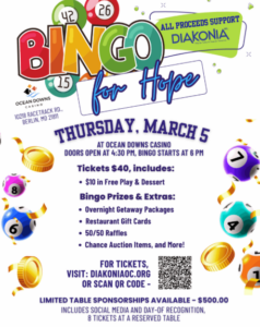 Berlin, MD — Diakonia, Inc. invites the community to join them for Bingo for Hope, an exciting night of bingo, prizes, and fun—all in support of Diakonia’s mission to provide Help for Today and Hope for Tomorrow.